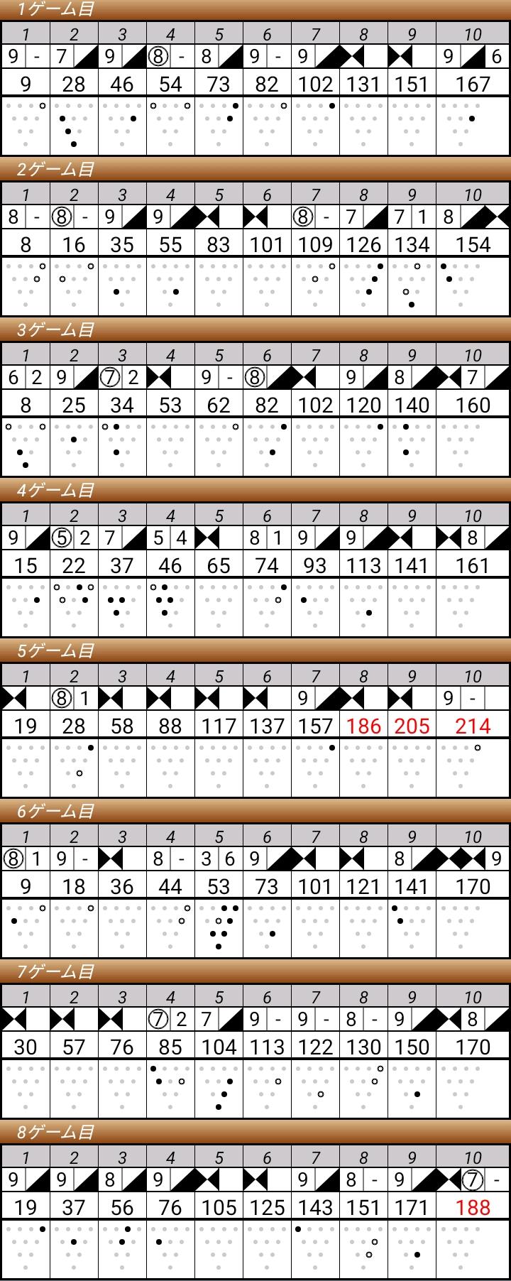 まとめる、と言えば、レーンを掴んで後半で持ち直して200、という基準かもしれませんが、そこまでは期待できません。トータルで170にまとまれば上出来。今までだと150を下回ることもざらでしたが、そこまではいかない。アベレージが170に行くというのはそういうことなのでしょう。